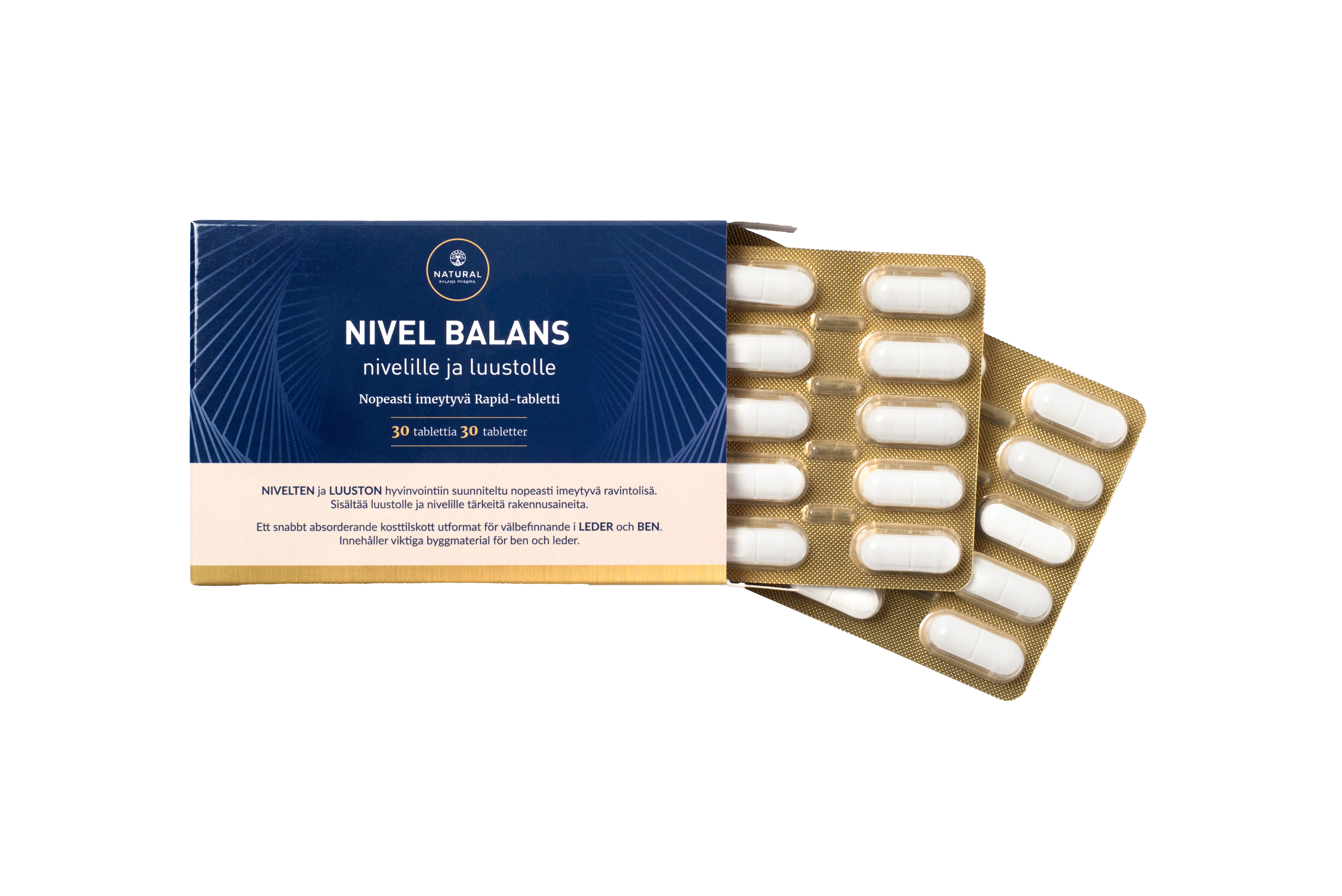 Nivel Balans on yksi markkinoiden monipuolisimmista valmisteista luuston ja nivelten hyvinvointiin. Se sisältää, kalsiumia, magnesiumia ja D-vitamiinia, jotka edistävät luiden pysymistä normaaleina. Sen sisältämä C-vitamiini edistää normaalia kollageenin muodostumista rustojen normaalia toimintaa varten. Lisäksi se sisältää Glukosamiinia.
