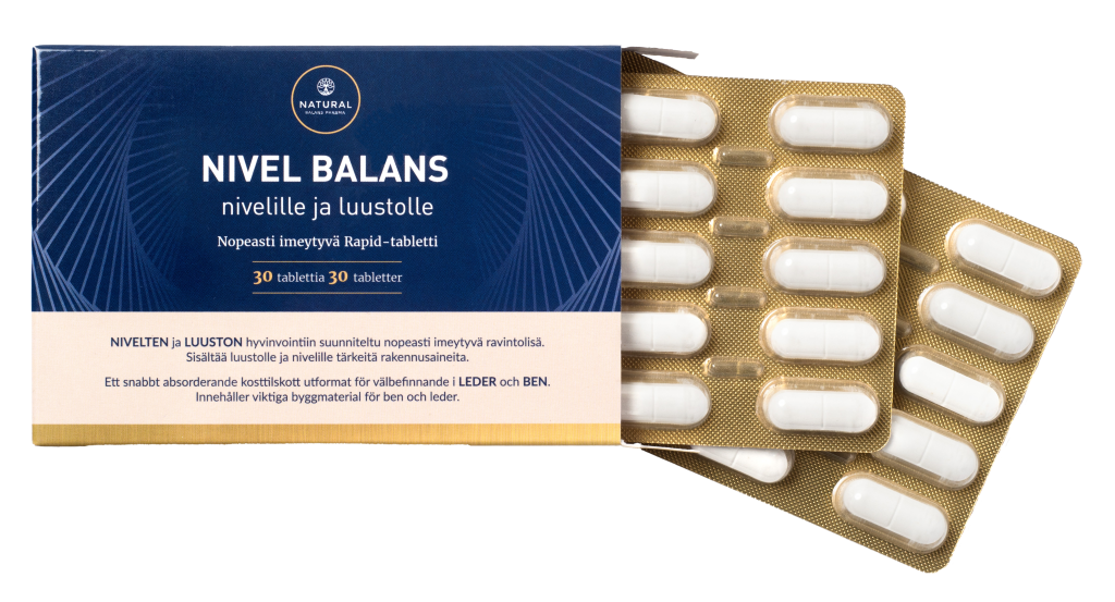 Nivel Balans on yksi markkinoiden monipuolisimmista valmisteista luuston ja nivelten hyvinvointiin. Se sisältää, kalsiumia, magnesiumia ja D-vitamiinia, jotka edistävät luiden pysymistä normaaleina. Sen sisältämä C-vitamiini edistää normaalia kollageenin muodostumista rustojen normaalia toimintaa varten. Lisäksi se sisältää Glukosamiinia.